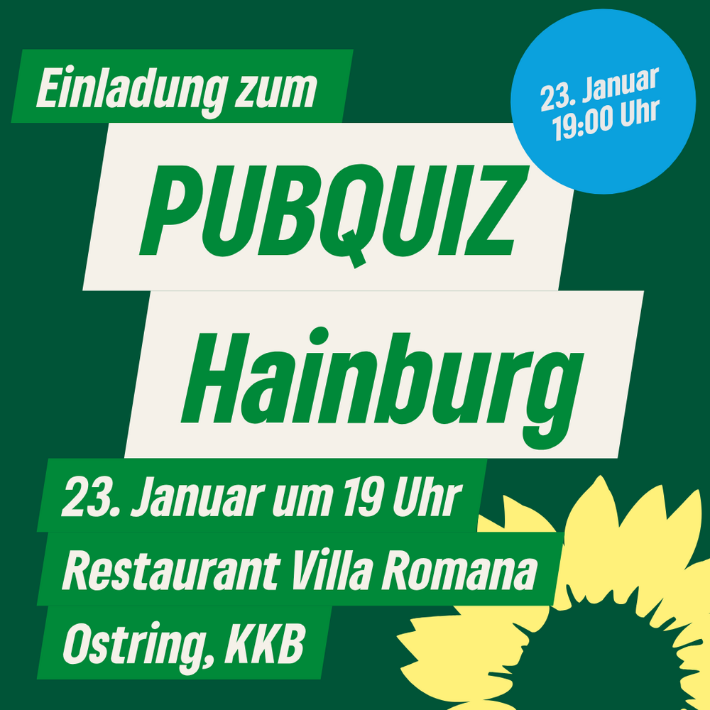Die Hainburger Grünen laden zu einem weiteren Pub Quiz in die Villa Romana ein. In gemütlicher Runde mit viel Spaß und AHA-Effekten sind interessante Fragen zur Gemeinde Hainburg, den Kreis Offenbach, Energiewende und Klimaschutz und anderen Themen in kleinen Gruppen zu lösen. Für die besten winken wie immer tolle Preise.