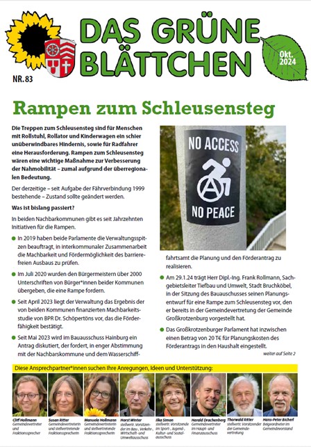 Im aktuellen Grünen Blättchen informieren die Hainburger Grünen über den Sachstand zum barrierefreien Zugang zum Schleusensteg, zur Renaturierung des Werniggrabens im Hainstädter Gewerbegebiet, zu Bordsteinabsenkungen in Kreuzungsbereichen und zum Kabarett der Spitzenklassse mit der Magdeburger Zwickmühle am 16.11.2024 in der Kreuzburghalle.