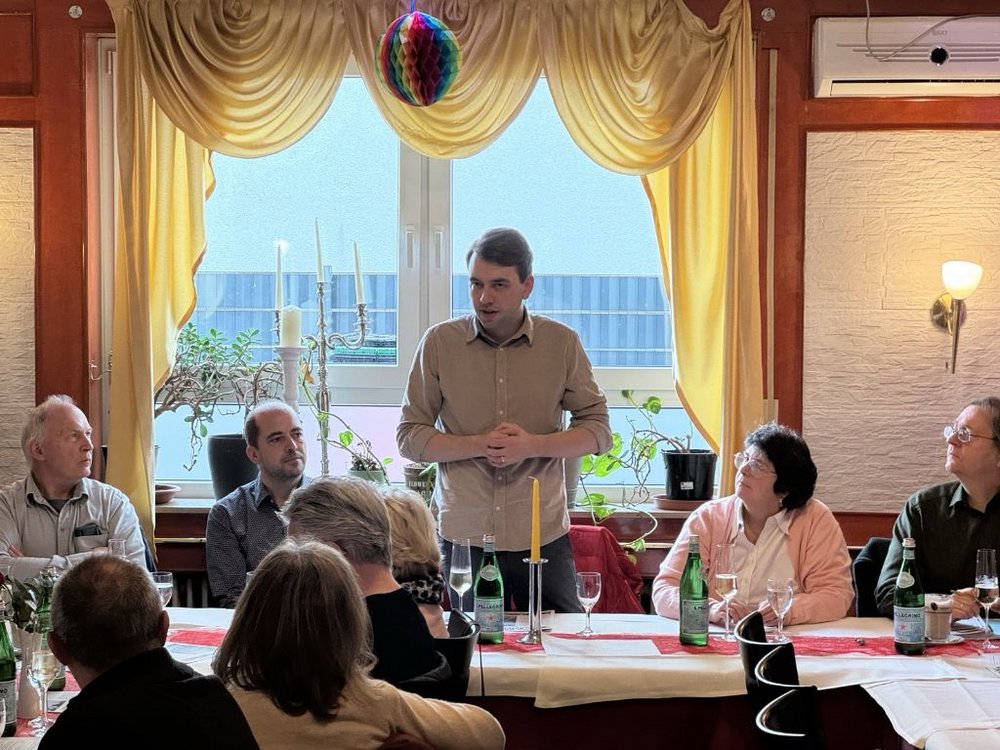 Als Hauptredner dankte der Bundestagsabgeordnete Philip Krämer, Mitglied im Verteidigungsausschuss, den anwesenden Gemeindevertreter*innen für deren ehrenamtliches Engagement in den Parlamenten und lobte den deutlichen Anstieg der installierten PV-Leistung im Ostkreis, der seines Erachtens nicht zuletzt auch durch kluge politische Entscheidungen und Gesetzesinitiativen der jetzigen Bundesregierung möglich wurde. Weiter verwies er darauf, dass nach dem Angriff Russlands auf die Ukraine die Versorgung mit Öl, Gas und Kohle innerhalb eines Jahres von Russland unabhängig gemacht wurde und dabei mit unbürokratischer finanzieller Unterstützung extreme Energiepreissteigerungen abgefedert wurden. Gelungen sei seiner Meinung nach auch neben der militärischen Unterstützung der Ukraine die Integrationsleistung bei der Unterbringung und Integration der Geflüchteten. Für positiv erachtete Krämer den Regierungswechsel in Polen - das „Weimarer Dreieck“ Frankreich – Deutschland – Polen könne seiner Ansicht nach zum Motor für den Fortschritt in Europa werden. „Die Europäische Union sollte die Subventionspolitik in der Landwirtschaft umgestalten und sich stärker der Förderung der europäischen Wirtschaft, dem Klimaschutz und sozialen Herausforderungen zuwenden. Die Grünen machen den Unterschied, wir stehen für eine wertebasierte, zukunftsfähige Politik.“, so Krämer.