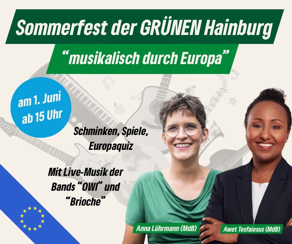 CDU und SPD haben mit einem Bürgerempfang und 1.Mai-Fest vorgelegt - wir Grünen ziehen nach...... und laden Euch und alle Interessierten recht herzlich zu unserem Europa-Sommerfest mit folgendem Ablauf / Highlights ein: